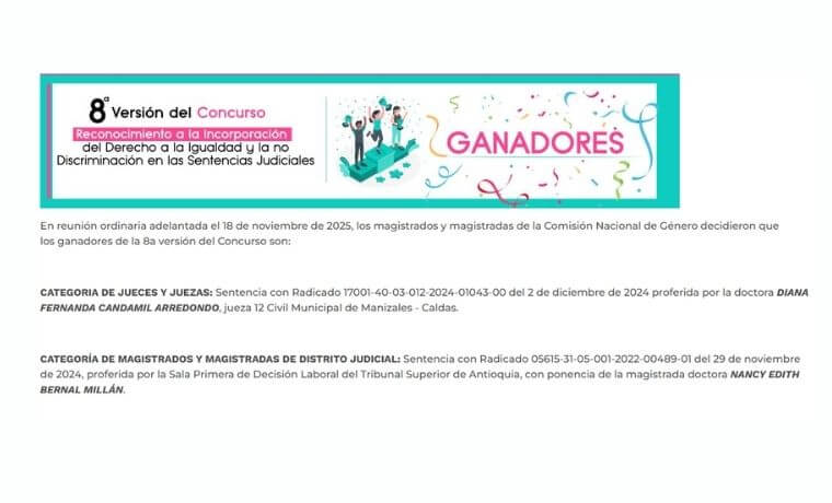 El Distrito Judicial de Manizales ratifica su liderazgo nacional en la 8ª Versión del Concurso de Sentencias de Género