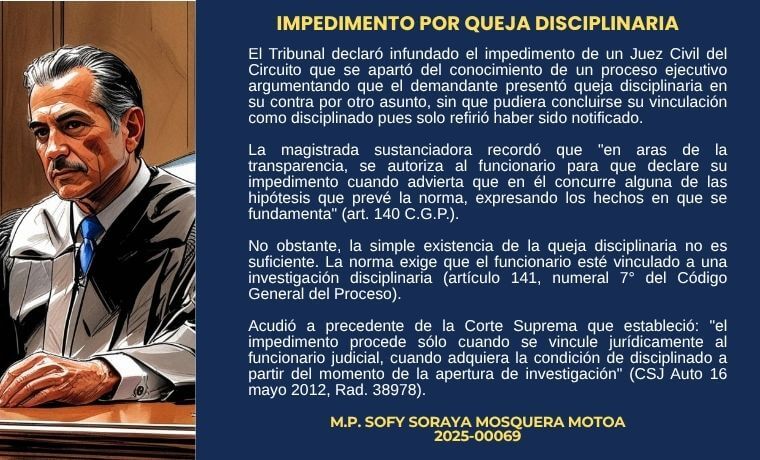 Auto No. 2025-00069 El Tribunal Superior declaró infundado impedimento por no acreditar la vinculación formal al proceso disciplinario. El cognoscente alegó impedimento basado en queja